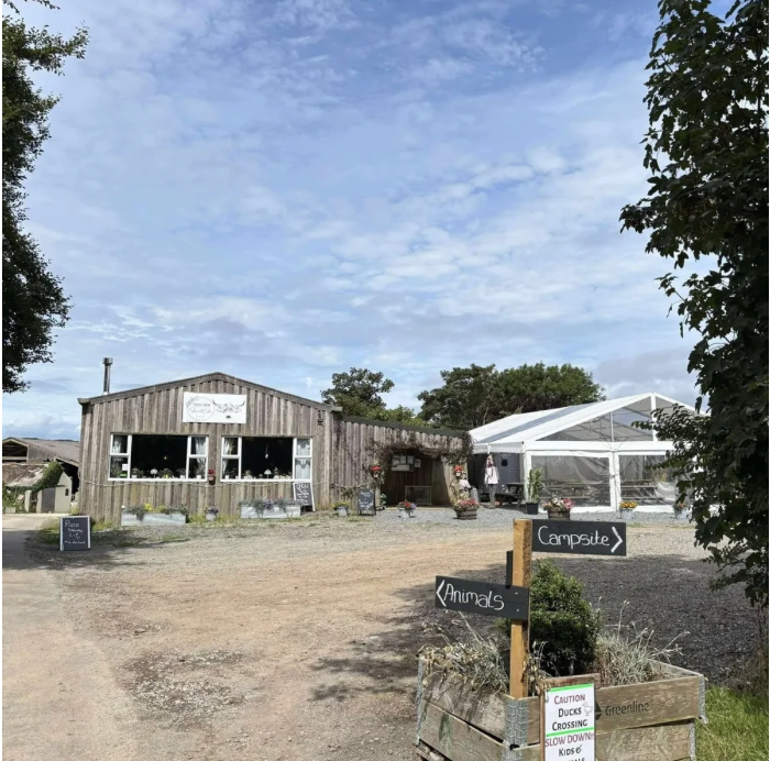 Look for the rustic "Trerise Farm" signs just past the old church tower.